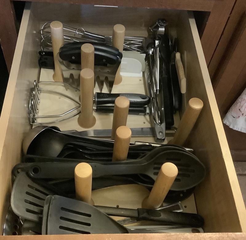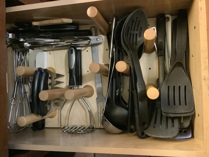 We have several large and deep drawers in our kitchen that always became cluttered with disorganized pots, pans and lids. We installed a 9 Peg Board Drawer Organizer by Rev-A-Shelf. We have installed several Rev-A-Shelf systems in the past and are always happy with the quality, ease of install and functionality. The 9 Peg Board Drawer Organizer has held true to those expectation. With a single cut of the board it fit easily into the bottom of my drawer. The 9 pegs can be placed however you need. Our drawer is now very organized and items are no longer sliding around when we close the drawer. Great product.