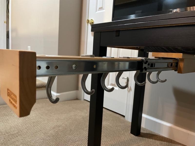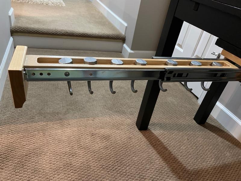 I installed this organizer in my kitchen cabinet to hang my frying pans and their lids, and I’ve been loving it!! The slide system is smooth and sturdy, it’s easy to access everything without any trouble. The hooks are strong and perfectly spaced to accommodate my pans and their lids securely. The natural maple finish looks sleek and blends nicely with my kitchen cabinets. It has freed up so much space in my cabinet and made my kitchen much more organized. I loved it so much that I’m planning to purchase a few more to use in other cabinets.